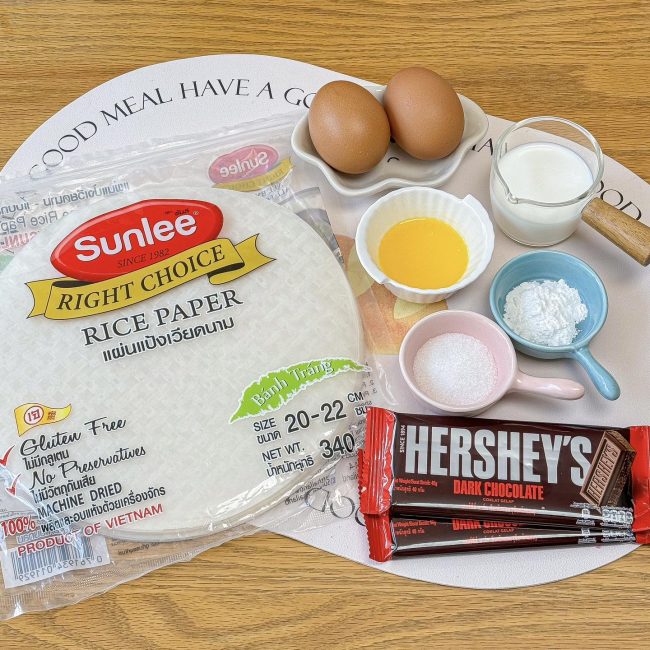 -ผสมไข่ นม เนยละลาย และผงฟูให้เข้ากัน นำแผ่นแป้งปอเปี๊ยะมาจุ่มแล้วนำมาซ้อนทับกัน 3-4 แผ่น จากนั้นตัดให้เป็น 3 เหลี่ยมตามรูป นำมาวางซ้อนทับกัน แล้ววางช็อกโกแลตแท่งลงไปกลางแป้ง ม้วนน้อนได้เลย เมื่อม้วนเสร็จก็นำไปใส่หม้อทอดแล้วทาไข่แดงและโรยน้ำตาล อบที่ไฟ 170° 10-15 นาที ก็เสร็จแล้ว