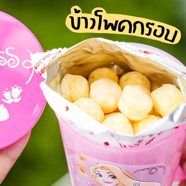 แพคเกจมี 2 แบบสีฟ้ากะสีชมพูวววว พร้อมเจ้าหญิงดิสนี่ย์ 2 พระองค์ มีฝาด้วยย เปิดฝาออกมา ข้างในเป็นขนมข้าวโพดกรอบบบ น้องเป็นข้าวโพดกรอบลูกขนาดปุ๊กปิ๊กกกกก ว่าด้วยเรื่องของรสชาติ น้องกรอบ ฟูววว หวานๆ เคี้ยวเพลินๆ ตามมาตรฐานขนมหลอกเด็กทั่วไปอะ