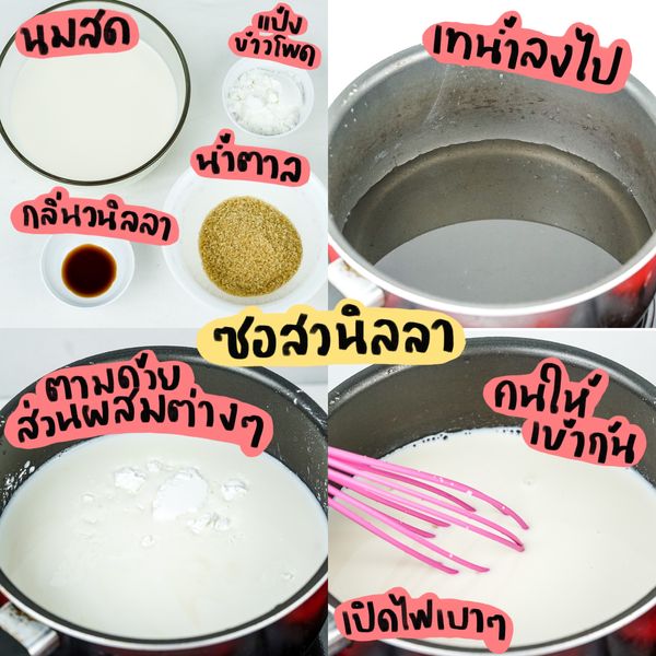 -นำส่วนผสมทั้งหมดเทรวมกัน คนให้เข้าที่ ให้แป้งข้าวโพดละลายเข้ากับส่วนอื่นๆ