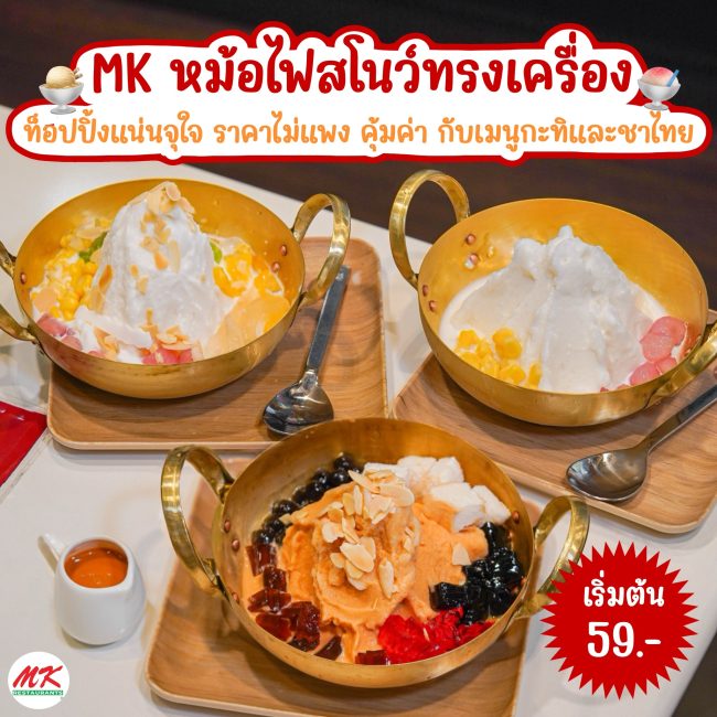 🍨ทุกคน! MK ออกเมนูใหม่! ครั้งนี้เป็นหม้อไฟสโนว์ทรงเครื่อง 🍧 มี 2 แบบให้เลือกคือ น้องหม้อไฟสโนว์กะทิ กับหม้อไฟสโนว์ชาไทย 😋 เริ่มต้นเพียง 59 บาท บอกเลยว่าต้องไปตำจ่ะ เพราะมันอร่อยมากกก! แถมยังมีท็อปปิ้งให้เลือกเพียบเลย