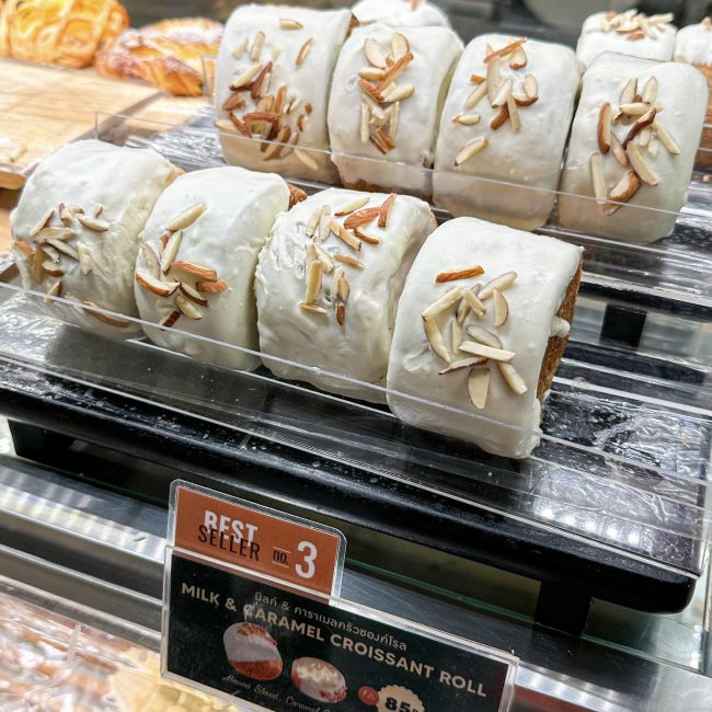 แป้งครัวซองท์กรอบๆ หอมเนยมาก ไส้ก็แน่นทะลักฉ่ำๆ แบบสุด ไส้คือดีมากๆๆๆ เป็นไส้ครีมนมคาราเมลหอมๆหวานๆ มีความรัวๆของเนย ครีมมี่นุ่มละมุนสุดๆ ด้านบนเคลือบด้วยไวท์ช็อกโกแลตหนาๆ กรอบๆ มีอัลมอนด์โรยมานิดหน่อยพอให้เคี้ยวเพลินๆ อร่อยมาก
